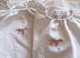完成したスモックは遊び着に。ワンコスタンプに「R」と刺繍。